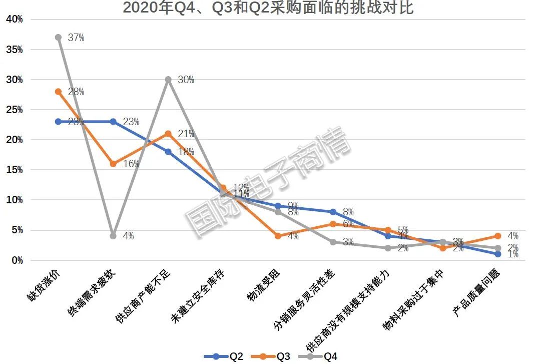Q4采购面临的挑战几乎与Q3相同,仍是来自上游供应端的“缺货涨价”和“供应商产能不足”两项,而且这两项的占比相比Q3有非常大的增幅,比如,“缺货涨价”由Q3的28%增长至Q4的37%,“供应商产能紧张”由Q3的21%增长到Q4的30%。