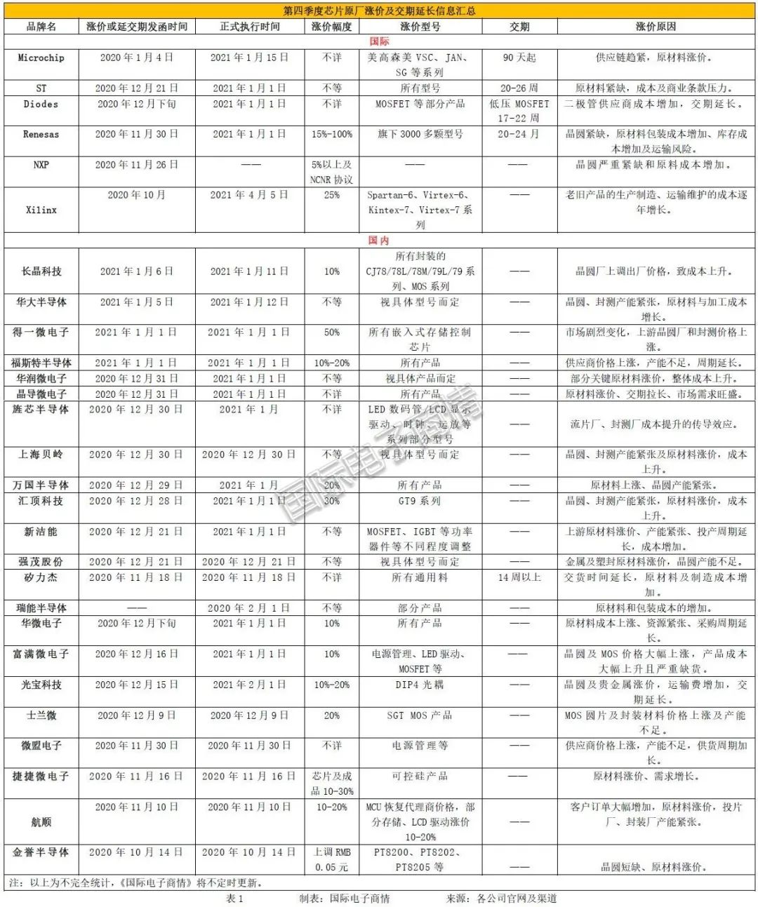 Q3多个国际半导体大品牌已经出现多型号的缺货迹象,Q4更加重了这一趋势,ST、NXP、Renesas、Microchip、Xilinx等原厂纷纷祭出涨价通知,Microchip甚至在1个月内各发布延长交期和涨价函一次。