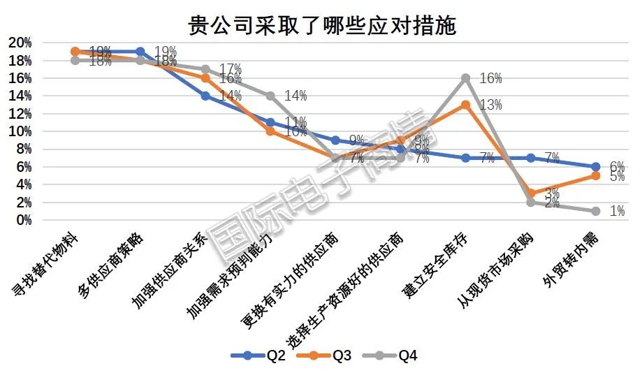 在应对策略方面(图5),Q4采购采取的措施大致与Q3相同,寻找替代、多供应商策略、加强供应商关系、加强需求预判等等,其中“建立安全库存”成为最为突出的选项。