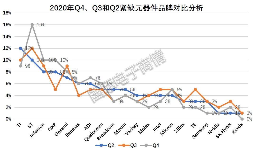 如图5所示,从Q2-Q4紧缺元器件品牌对比来看,Q4最为缺货的品牌是ST,且相比Q2和Q3缺货程度有迅猛拉升,Infineon和NXP次之,可能跟汽车对元器件的需求增加有关。