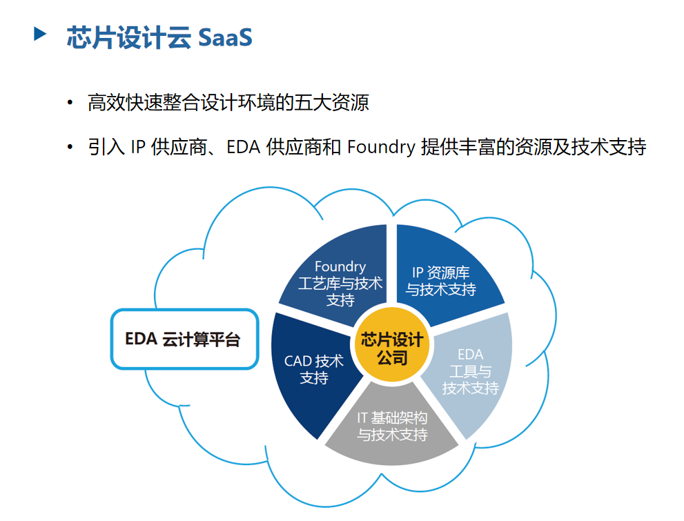 在这个行业急速发展阶段,通过云计算的模式,进行半导体行业资源整合,来加速集中解决我们国内芯片设计用户所面临的问题,加快缩短差距,将会是一个有效的解决路径。芯片设计云的模式,可以将IT基础架构层与技术服务、CAD 管理与技术服务、EDA工具与技术服务、IP 资源库与技术服务、 PDK 资源库与技术服务等五个方面的资源整合,来支撑芯片设计公司的项目需求。