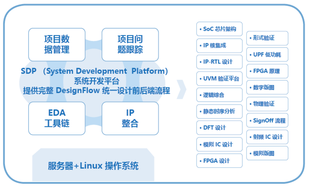 一站式的专业技术支持包括设计环境的上云的方案规划、到集成交付、再到运维支持。咨询服务:包括环境调研分析、安全调研分析、IT基础架构调研分析、上云路径分析、上云方案书等;实施服务:包括云资源订阅、IT基础架构部署、设计数据、设计环境、设计流程、弹性计算等;运维服务:包括用户培训、环境监控和优化、成本分析优化等。我们根据上云方案书进行云资源订阅并按照标准的设计环境搭建和配置 IT 基础架构、设计数据目录、设计环境、设计流程以及弹性资源池等,为用户提供标准和统一的登陆方式和设计环境。为芯片设计企业提供标准和统一的设计环境,以及设计平台服务。以云计算为 IT 基础底层,整合行业核心资源,打造统一化的芯片设计 EDA 云平台。集成包括:IT基础架构层与技术服务、CAD 管理与技术服务、EDA 工具与技术服务、IP 资源库与技术服务、 PDK 资源库与技术服务等五大技术支持平台的整合型设计生态环境。