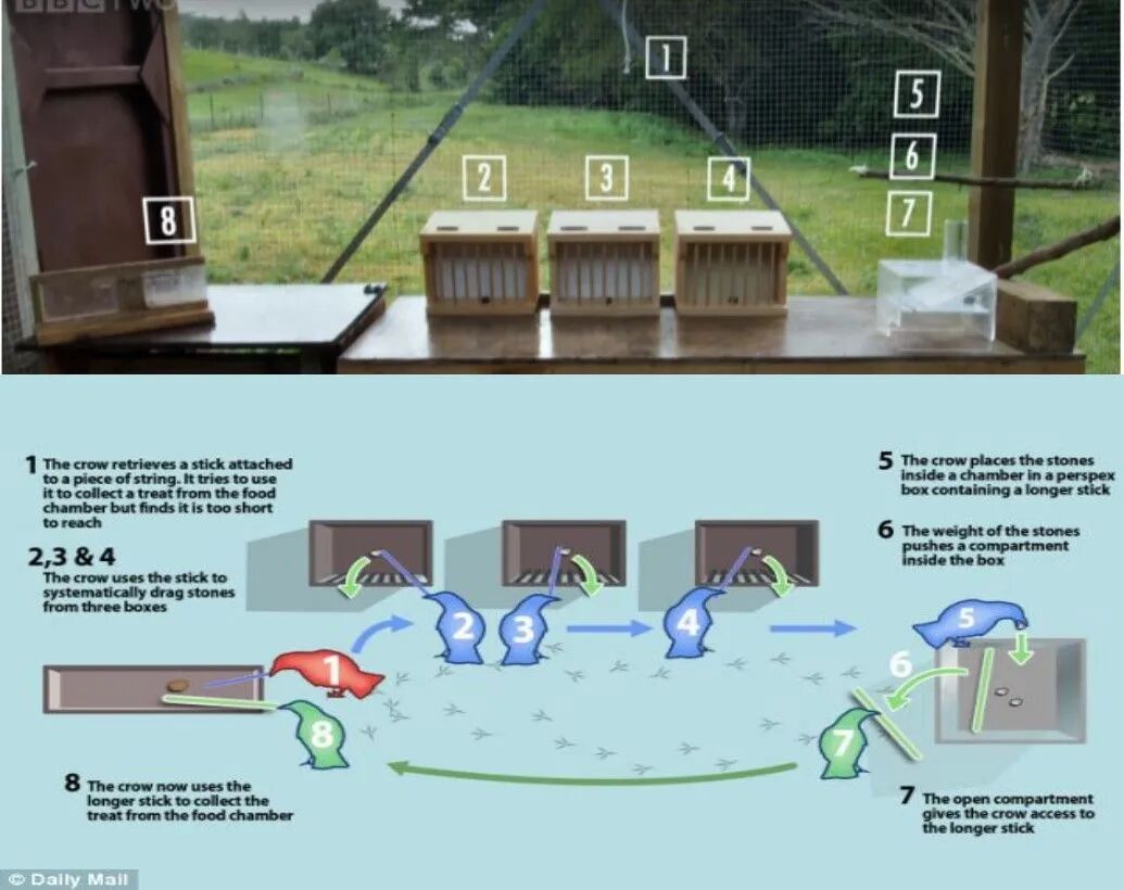 复杂的“解谜”小游戏,这只乌鸦说不定比你还厉害点(图中序号对应上文序号,图源:dailymail.co.uk)
