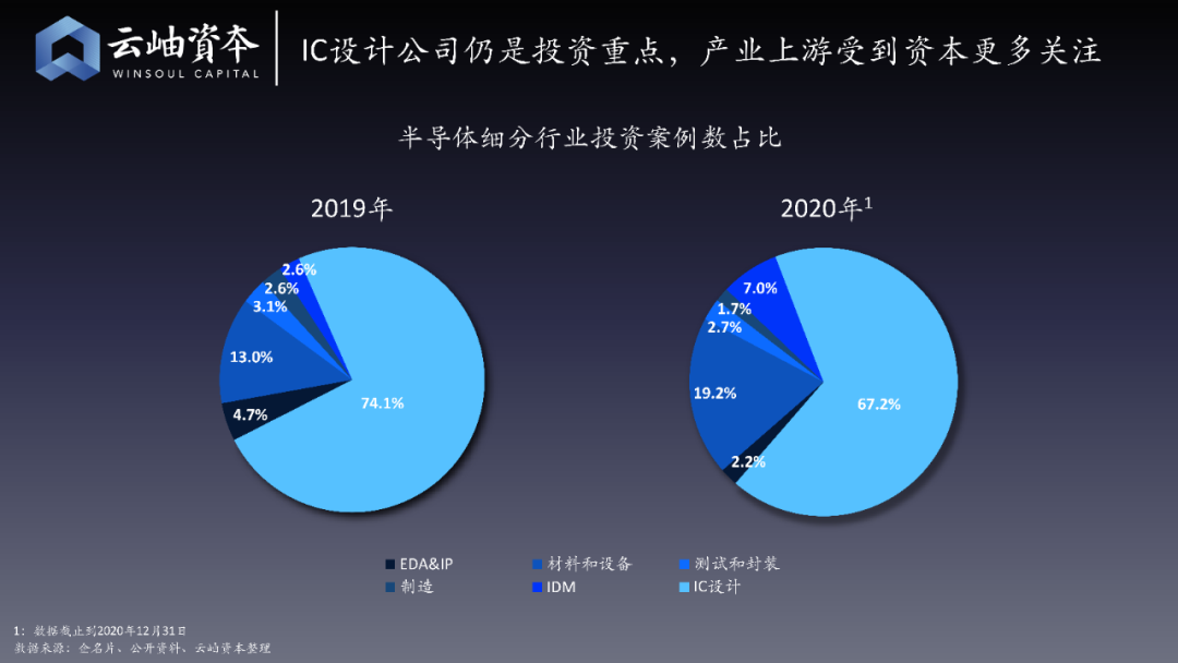 从细分方向来看,半导体设计公司仍然是投资重点,产业上游也受到资本更多的关注。2019年,材料和设备领域的投资比重是13%,2020年已经增长到19.2%。