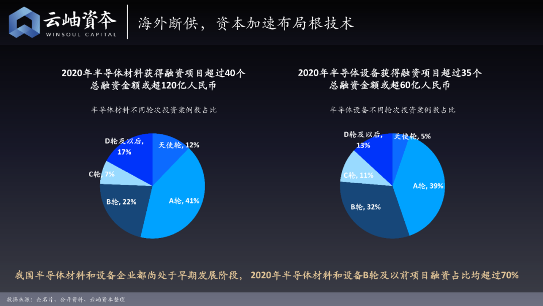 而在国内,由于存在断供问题(例如中芯国际上了实体清单、华为流片也是受到限制等),半导体材料和设备等上游产业更加受到资本青睐。其中半导体材料领域总融资金额超过120亿元人民币,设备总融资金额超过60亿元人民币,但在材料和设备领域中,项目普遍还处于早期发展阶段,A、B轮的比重超过50%。