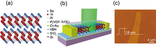 探测器的结构示意图。(c)18 nm厚InSe薄片的