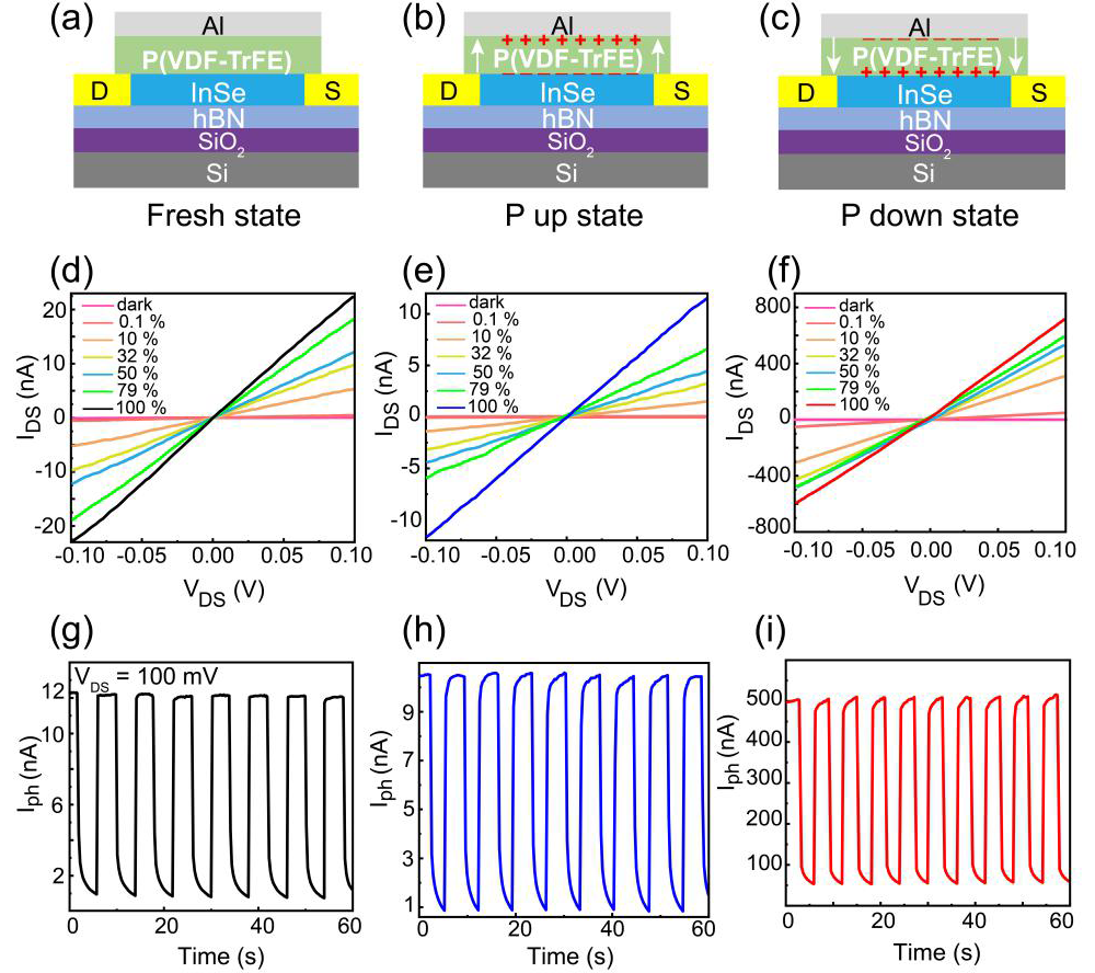 (图2 a-b)。InSe 晶体管在铁电P(VDF-TrFE)薄膜三种极化状态调制下的输出特性表明
