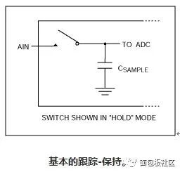 跟踪-保持往往也被称为“采样-保持”,指ADC的输入采样电路。跟踪-保持输入的最基本表示形式是模拟开关和电容(见图)。开关闭合时,电路处于“跟踪”模式;开关开路时,采样电容保持输入的最后瞬态值,电路处于“保持”模式。