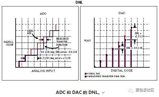 对于ADC,触发任意两个连续输出编码的模拟输入电平之差应为1 LSB (DNL = 0),实际电平差相对于1 LSB的偏差被定义为DNL。对于DAC,DNL误差为连续DAC编码的理想与实测输出响应之差。理想DAC响应的模拟输出值应严格相差一个编码(LSB)(DNL = 0)。(DNL指标大于或等于1LSB保证单调性。)(见“单调”。)
