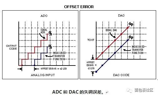 失调误差常称为“零幅”误差,指在某个工作点,实际传递函数与理想传递函数的差异。对于理想数据转换器,第一次跳变发生在零点以上0.5LSB处。对于ADC,向模拟输入端施加零幅电压并增加,直到发生第一次跳变;对于DAC,失调误差为输入编码为全0时的模拟输出。