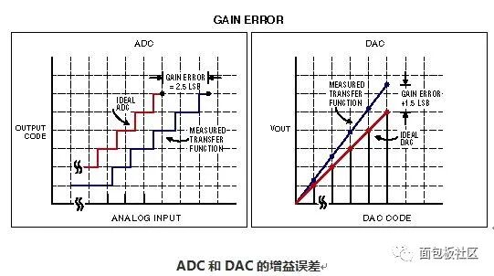 ADC或DAC的增益误差表示实际传递函数的斜率与理想传递函数的斜率的匹配程度。增益误差通常表示为LSB或满幅范围的百分比(%FSR),可通过硬件或软件校准进行消除。增益误差等于满幅误差减去失调误差。