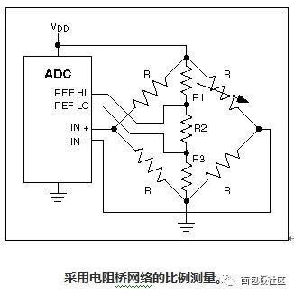 施加至ADC电压基准输入的电压不是恒定电压,而是与施加至变送器(即负载单元或电桥)的信号成比例。这种类型的测量称为比例测量,它消除了基准电压变化引起的所有误差。下图中使用电阻桥的方法就是比例测量的一个例子。