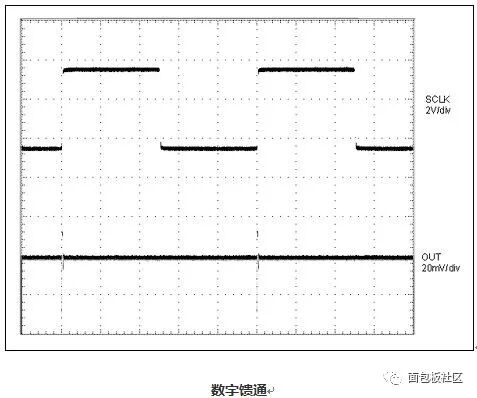 数字馈通是指DAC数字控制信号变化时,在DAC输出端产生的噪声。在下图中,DAC输出端的馈通是串行时钟信号噪声的结果。