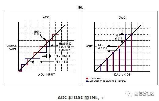 对于数据转换器,积分非线性(INL)是实际传递函数与传递函数直线的偏差。消除失调误差和增益误差后,该直线为最佳拟合直线或传递函数端点之间的直线。INL往往被称为“相对精度”。