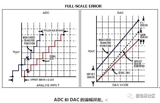 满幅误差为触发跳变至满幅编码的实际值与理想模拟满幅跳变值之差。满幅误差等于“失调误差+增益误差”,如下图所示。