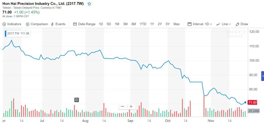 2018年,iPhone X系列销量不及预期,连带全产业链在2018年全年遭遇大跌,富士康母公司鸿海精密的股价也从年初的118元跌到的年末的70元。而今年的情况同样不乐观。