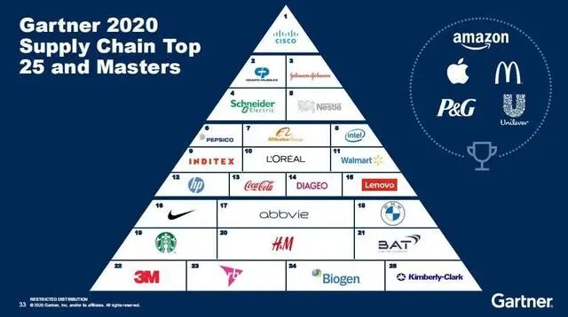 在Gartner公布的全球供应链TOP25榜单中,苹果被评为最高的“Master”(大师级),就好比是“皇冠上的明珠”,苹果也是五家“Master”公司中唯一的高科技公司。