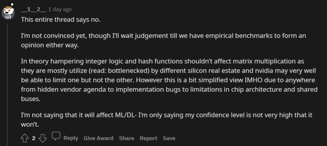 但还有一部分人持观望态度,认为:「从理论上来说,阻碍整数逻辑和哈希函数应该不会对矩阵乘法产生影响,因为它们利用的硅片空间是不同的。英伟达可能很好地限制其中一个,但不限制另一个。然而,由于存在实现缺陷以及芯片架构、共享总线等方面的限制,直接作出『不会影响』的结论未免有些草率。真实情况如何还需要等待进一步的测试结果。」