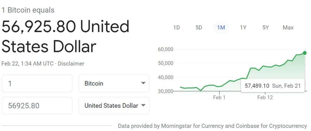 图源:https://www.anandtech.com/show/16493/nvidia-launches-cmp-dedicated-mining-hardware目前,我们还不清楚英伟达施加的限制以及挖矿专用芯片的推出会在多大程度上降低「矿工」们抢购 RTX 3060 的积极性,也不清楚这种限制是否(何时)能被破解,只能拭目以待。RTX 3060 预计将于 2 月 25 日以 329 美元的价格推出,但到手价肯定远高于此,如果矿工们对它的热情有增无减,情况将会更加糟糕。在这轮挖矿高潮出现之前,英伟达安培架构的 GPU 已经供不应求,短期内这一问题可能无法缓解。自 2 月初伊隆 · 马斯克爆出特斯拉花费了 10% 的现金储备(15 亿美元)投资比特币,还表示消费者今后能够直接使用比特币购买特斯拉电动车之后,比特币等热门虚拟货币经历了大涨,这是比特币历史上最大的一笔由企业发起的投资,截止 2 月 22 日,比特币又创了历史新高,价格已经达到 5.7 万美元一个,最高触及 5.8 万美元,总市值则早已超过一万亿美元。
