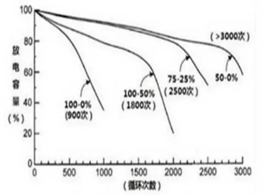 的寿命影响不一样,如上图数据,以25%-75%充放电的寿命可以达到2500次,即我们所说的电池浅充浅放。电池寿命这个话题我们以后还会深入讨论。