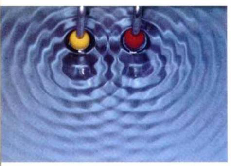 声波的干涉和下图中水波的干涉现象类似。在波峰与波谷相重合的地方,两列波的相位相反,合振幅最小,波动强度甚至可能为零。
