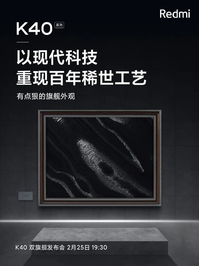 而在本次透露的海报中除了有明星代言人以外就是本次新品的外观了。Redmi 红米手机官方公布了 Redmi K40 的第一张实拍图:「墨羽」,用现代科技,重现大马士革钢刀最美纹路。