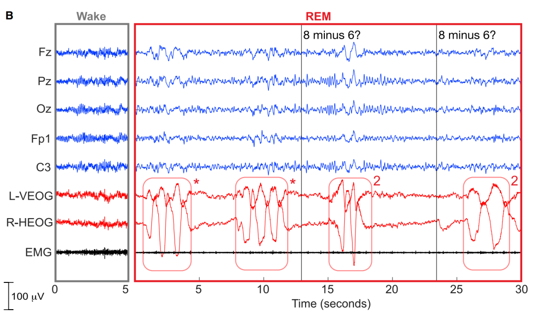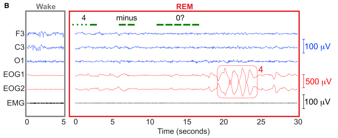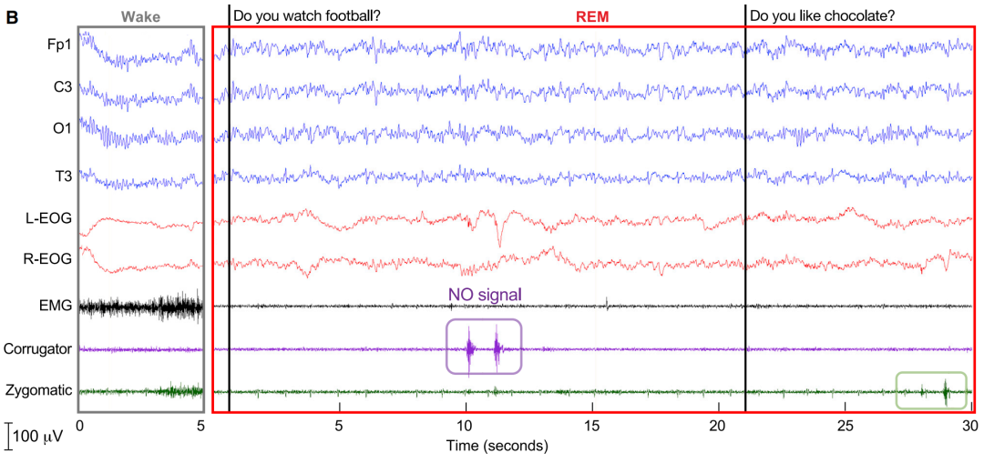 那么这一过程被转换成梦境会是怎样呢?根据被试醒来后的回忆,他一开始发现自己在一个停车场,外面是黑夜。突然场景变成了白天,自己进入到了电子游戏中。此时他已经意识到这是在做梦了。然后他全身的肌肉失去控制,感受到了从血液冲击到耳朵的声音,声音描述的是一些数学问题,大概有3个,比如最后一个是“8减6等于多少”。被试回忆自己在梦里所有的回答都是“2”。而这也是眼电信号展示出的结果,在实验者问出8减6时,也能对应上两次眼电信号。