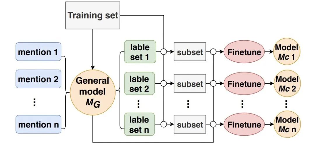 实体标准化(类似实体链指)通常采用SR(selecting and re-ranking)方式,即先召回后排序,论文给出中文医学实体标准化中存在一对多的情况(multi-implication),提出GR(generating and re-ranking)方法,即采用生成模型得到候选,然后再对候选排序。 下图为生成模型结构图,文章对生成模型做了两点重要改进:Constraint decoding 和 Catebory-based refining: Constraint decoding:使用ICD9作为KG,按ICD9的编码规范将标准实体进行分类,并对每类标准实体构建前缀树,如下图虚框所示。使用生成模型seq2seq机制,target术语首token增加其所属类别的label,在解码阶段,先解码出label,在之后的解码中,每次输出都限制在label前缀树的某一层(解码约束),如图示例,label-2后的解码空间为(大,脑,颅,环),再之后解码空间是(修,深),控制解码空间可通过在做MASK得到,生成模型可以得到多个label的结果,直到产生(类似实体链指)通常采用SR(selecting and re-ranking)方式,即先召回后排序,论文给出中文医学实体标准化中存在一对多的情况(multi-implication),提出GR(generating and re-ranking)方法,即采用生成模型得到候选,然后再对候选排序。 Catebory-based refining:使用training数据集训练得到模型Mg,然后对test数据集预测得到各个样本的label,按label将test划分为n个subset,然后使用每个subset对Mg迭代进行finetune,得到最终模型Mc: 在预测阶段使用模型Mc,通过设置beam size控制生成候选的量,当beam size=1时,生成的label数目K作为标准实体的数目。对候选和原实体进行编码,然后计算相似得分对候选进行排序,topK作为最终的预测结果,整个过程可以看着是GR(generating and re-ranking)。 论文在CHIP2019术语标准化任务上进行实验,在Test集合上得到89.3%的结果。 模型生成label的准确率和bz=1时生成的label数目对最终结果影响比较关键,实际上直接对原实体进行分类,判断其标准实体的数目,也是能够解决mutil-implication的问题的,而且可以独立优化这个环节。论文对生成模型在解码阶段增加约束限制是一个值得借鉴的亮点。