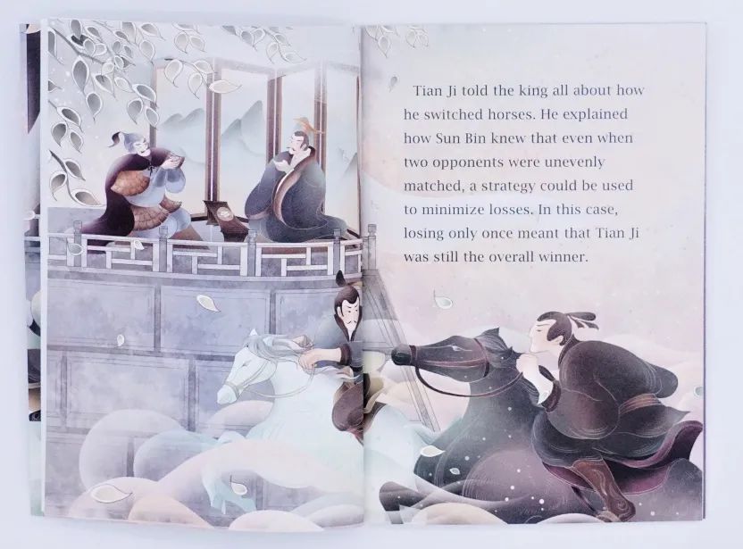 贴心的是,书末的二维码可以提供适应性测评,让万千小读者选择合适的起点。此外,每个故事末尾都配有核心词汇表,可以在阅读之前进行了解,提高阅读体验。配套的阅读手册,还对阅读前、中、后几个阶段提供了贴心实用的阅读指导。将这套书读厚或是读薄,一切取决于你。在英文写作中,一大原则就是避免重复,即用不同表述代指同一样事物。在《田忌赛马Racing Horses》中讲述如何用下等马对上等马、中等马对下等马时,虽然情节一致,但每次使用的英文措辞都不一样。母语为英语的写作老师会特别注重孩子写作的“可读性”,使用丰富的词汇,例如Happy(开心的),可替换词包括Joyous,Blissful,Cheerful,Delighted,Thrilled;Sad(伤心的),可替换词包括Miserable,Gloomy,Sorrowful,Melancholy,Unhappy;Big(大的),可替换词:Gigantic,Tremendous,Colossal,Massive,Enormous等等。对单词表囫囵吞枣的背诵,无论对孩子口语或者写作的输出,都是收效甚微的——通过阅读精心编排的文本,在语境中掌握地道准确的用法,才是学习使用替换词最多快好省的方法。故事的主题也是循序渐进的,中低阶分册引导孩子思考对待人生的积极态度和圆融智慧,慢慢过渡到高阶分册,则进一步探讨有关家庭、责任和个人选择的复杂主题。每篇文章后的互动问题,也从初阶“你的梦想是什么,怎么实现它?”(《鲤鱼跃龙门The Dragon Gate》)渐进到了中阶的“讲述一个看起来糟糕最后却帮助了你的事情”(《塞翁失马,焉知非福Good or Bad?》)再到高阶的“与别人不同如何给你带来帮助他人的机会?请举例说明”(《神农尝百草The Ox-Man》)